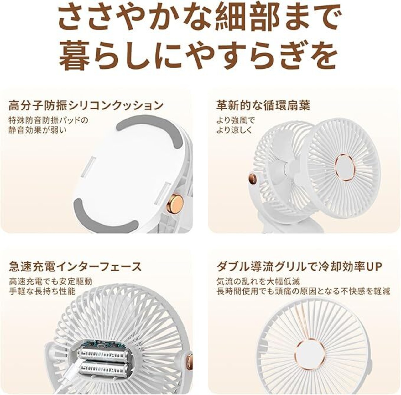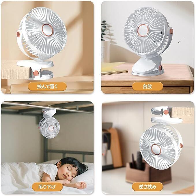 【卓上扇風機・クリップ・壁掛3つの使い方】これですクリップ式卓上扇風機は手動で左右上下に360度の調整が可能、どんな向きにも涼しい風を届けてくれます。クリップの力が強くて、落ちにくいデザイン、直径は約3-5cmまで固定可能、クリップ式で場所の制限がなく、卓上、車中、ホーム、オフィス等いろんなところで使用可能です。机の端を挟んでスペースが取らず、非常に使用便利、クリップ+コードレスでアウトドアにも大活躍。また、クリップの底部には壁掛け用フック穴があり、壁に掛けてもご使用いただけます。長押しすとる電源OFF、いちいち最後の風量モードまで押す必要がありません。エアコンと併用すれば、設定温度を抑えられるので節電につながり、一年中ご利用いただけます。